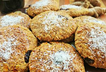 - En un bol colocamos todos los ingredientes secos (avena, cúrcuma, bicarbonato, sal), mezclamos y añadimos los ingredientes líquidos (miel de palma. margarina, agua o leche) y empezamos a amasar con los dedos haciendo "migas" hasta que se incorporen todos los ingredientes. Se puede añadir más líquido si queda muy seca. Añadimos las pasas y amasamos otra vez. Debe quedar una masa homogénea un poco densa. Dejamos reposar 10 minutos.
