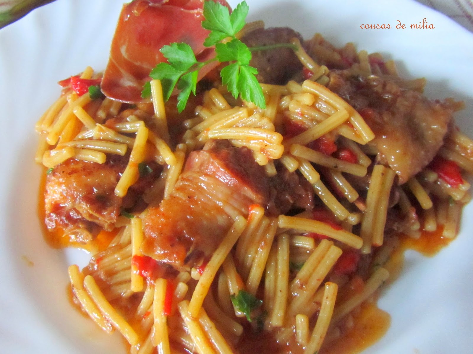 Cuando esté cocida la gallina, añadimos los fideos a la cazuela y dejamos cocer unos 10 minutos, controlando la cantidad de líquido, si fuese necesario agregamos caldo caliente, hay que tener en cuenta que este guiso debe resultar algo caldoso.