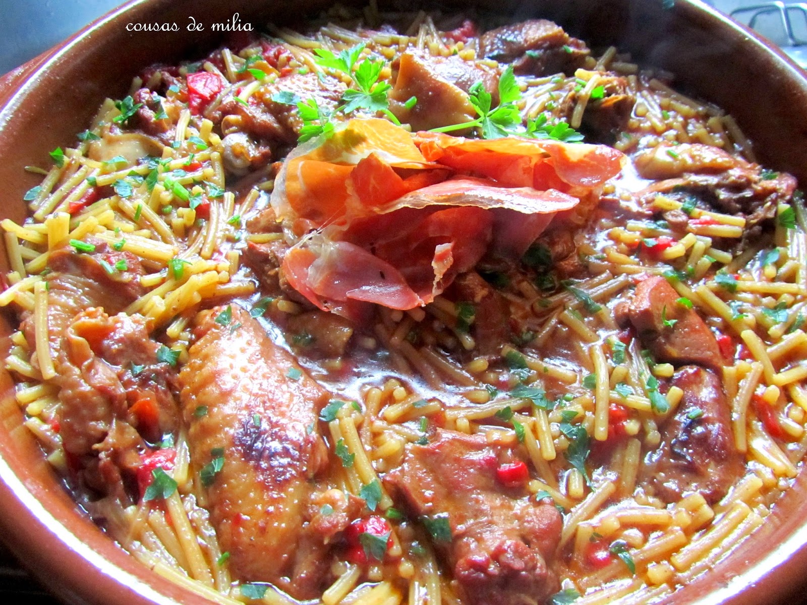 Ingredientes:(Yo prepare solo la mitad e a receta)1 gallina3 dientes de ajoAceite de oliva virgen1 cucharada de manteca de cerdo1 cebolla1 pimiento rojo75 ml de vino blanco1 tomate pequeñoUn atadillo de hierbas aromáticas (romero, tomillo, perejil)Unas hebras de azafránUnos clavos de olor