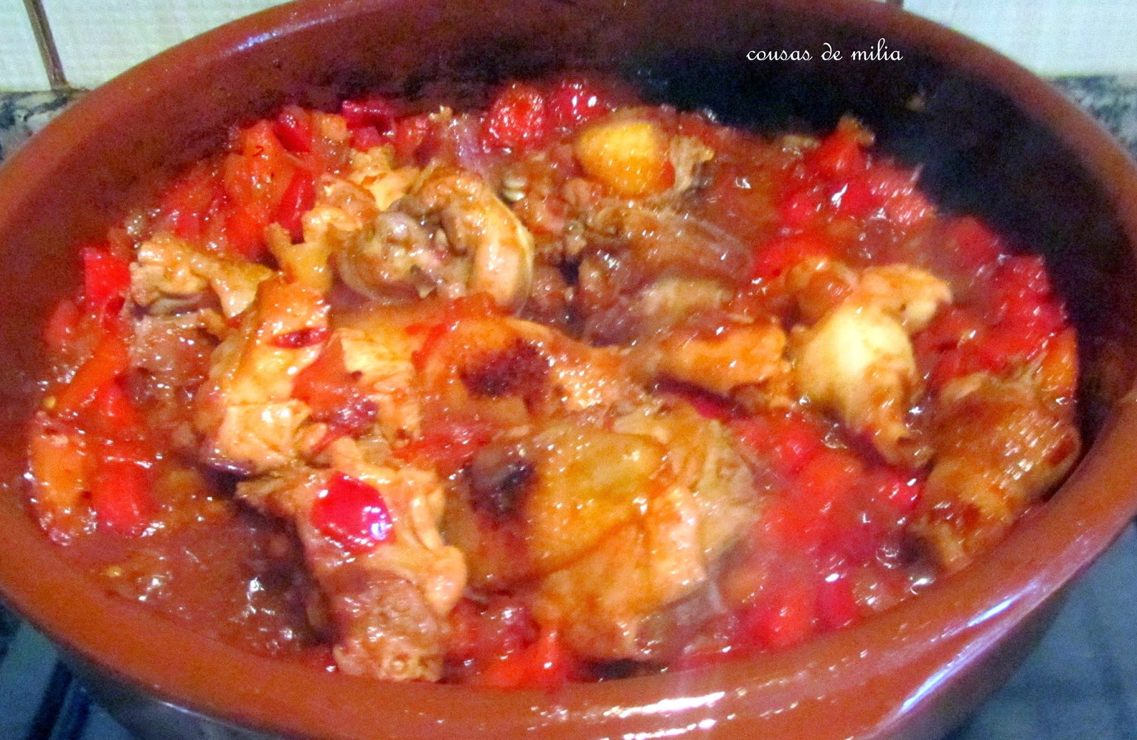 Cubrimos el fondo de una cazuela de barro con aceite de oliva y la cucharada de manteca de cerdo, rehogamos la gallina. Una vez dorada, bajamos el fuego y agregamos la cebolla y el pimiento picado, dejamos dorar ligeramente. Añadimos el vino, subimos un poquito el fuego y dejamos consumir un poco. Ponemos el tomate picadito y dejamos sofreír unos minutos, añadimos el atadillo de hierbas, los calvos y la sal.
