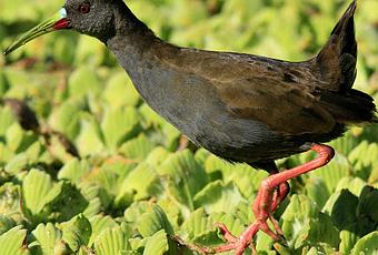 Estas aves buscaban alimento entre la vegetación acuática, no muy lejos de donde estaba, pero como no pasaban lo cerca que yo quería y en una zona despejada usé una grabación para llamarlas. Enseguida se pusieron alerta, en especial la adulta, que pasaba caminando rápido por los repollitos de agua, en especial cuando pasaba cerca mío; el individuo juvenil hacía lo mismo pro no se acerba mucho, permanecía unos cuantos metros más alejado. Repetí la grabación dos o tres veces hasta que finalmente quedó unos instantes enfrente mío vocalizando, marcando su territorio, desafiando al supuesto intruso.
