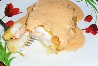 Ingredientes:8 filetes de gallo500 gr de langostinos cocidos1 cebolla pequeña5 pimientos del piquillo200 ml de natasalajo molidoaceitehuevoharinapan rallado