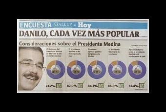Un 87.4% de la población aprueba la forma de gobernar del presidente Danilo Medina, revelan los resultados de la encuesta Gallup-Hoy que publica ese diario esta mañana.El gobernante mantiene altos niveles de popularidad a casi dos años de mandato, porque su estilo genera confianza y esperanza en la mayoría de los dominicanos y dominicanas, que aseguran Danilo Medina gobierna para el bienestar de todo el pueblo.