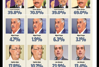 En el tercer escenario Fernández aparece con un 39%, Abinader, con 23.9, Moreno con 18.2% y Vargas Maldonado con 6.3%.