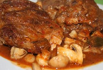 3. Agregamos la salsa y los champiñones, probamos de sal, y dejamos hervir durante 25 – 30 minutos más, hasta que las galtas estén tiernas.