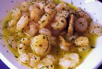 Una tapa española muy típica y deliciosa.- Dorar un diente de ajo laminado con media guindilla en un chorro de aceite. Añadir las gambas peladas, salar, dar unas vueltas, echar un chorrito de vino blanco y perejil; dejar evaporar y servir.