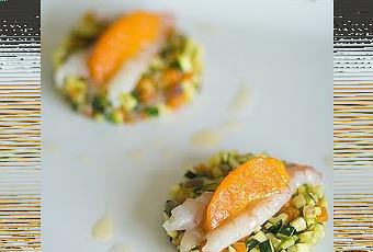 Preparación:Cortar las verduras en brunoise, es decir, en taquitos de unos 1-2 mm de lado.En una sartén con un hilo de aceite saltear las verduras durante unos 10 minutos hasta que estén doradas pero aún estén un poco enteras. Salpimentar.Pelar, lavar y retirar el intestino a las gambas. Abrirlas por la mitad sin llegar a cortarlas en dos, como si fueran un libro.Lavar y pelar el albaricoque. Cortarlo en 4 partes.Poner una sartén a calentar y espolvorear un poco de azúcar sobre la superficie. Disponer el albaricoque y dejar que se caramelice por ambos lados.Mezclar el zumo de limón y el de pomelo y, sin dejar de batir, añadir poco a poco aceite de oliva hasta que esté bien amalgamado.Rectificar de sal y pimienta.Disponer la brunoise de verduras templada, encima la gamba cruda y un trocito de albaricoque caramelizado, condimentar con el aceite de cítricos y servir.Fuente: amiloquemegustaescocinar