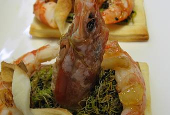 Colocamos el rectángulo y encima un poco de cebolla caramelizada, dos gambas peladas y la cabeza de una de ellas, le echamos unos brotes por encima y listos.