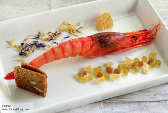 Yo os recomiendo que si queréis comprar gamba roja, lo hagáis como yo y después las preparéis cocidas y las sirváis de forma similar a como las he presentado yo. En el plato podéis ver la gamba cocida colocada estirada en el centro acompañada de bolitas de esferificación de aceite (de venta en el supermercado), trocitos de manzana y jengibre confitado, pétalos de flores comestibles muy picados y una galleta crujiente elaborada con los jugos de las cabezas de las gambas.