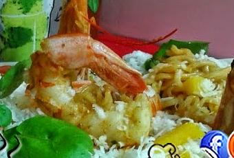 Gambones al curry con fideos chinos, mango, berros y coco fresco rallado.