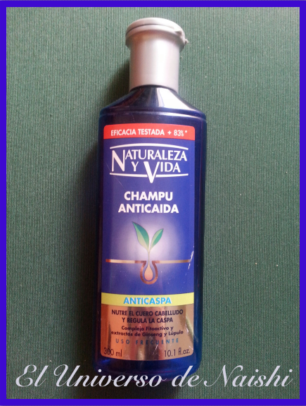 El primero de hoy es este champú de la marca Naturaleza y Vida, de la gama anticaída y este específico también para la caspa, me tocó en un sorteo de La Pinturera junto con otros 3 y dos productos de tratamiento, la verdad es que me gusta la marca y me deja bien el pelo, lo de anticaída no lo he notado mucho pero la verdad es que cuando lo usé no se me caía mucho el pelo, pero más vale prevenir que curar.
