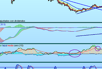 En el gráfico diario de Gamesa, se observa la divergencia alcista del MACD que ha provocado el último rebote, pero ha tenido tan poca fuerza que ni ha llegado a tocar su línea de tendencia, ni la media móvil de 90 periodos, como en el anterior.