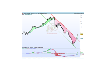 Ya venimos hablando desde hace tiempo del buen momento que está atravesando Gamesa. El precio en este valor se encontraba en un canal de gran pendiente bajista en gráfico mensual que le llevó desde los 34,6€ al euro. Pero en el último apoyo que realizó en el suelo del canal bajista tomó impulso y consiguió superar el techo del mismo en los 2,55€.