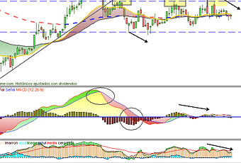 En el gráfico de Gamesa tenemos un triple techo en 1.78, resistencia que de momento está frenando cualquier intento de avance de la cotización. Los dos últimos toques han sido con divergencia del MACD, esto me hace pensar que la cotización tiene gran presión bajista y que lo más probable es que nos vayamos a la parte baja del lateral, 1.48.