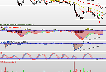 Esta semana hacía referencia a la posibilidad de rebote en Gamesa, y si nos fijamos en el gráfico diario de Gamesa, vemos como el precio está en un rango de precio sin moverse en exceso (alrededor de un 3%), a pesar de los vaivenes de la semana. Los indicadores siguen dando compra, muy especulativa y contraria a la tendencia principal: bajista. Quizás por eso hoy sólo se ha movido un 0,67%, mientras que el IBEX se ha dejado un 3,58%.