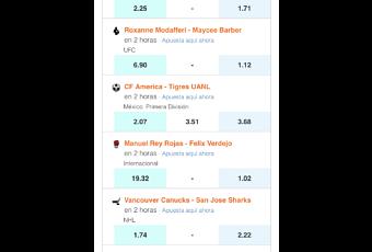 Como ves en la foto en cada parido o combate te dicen los nombres de los equipos o en caso de UFC o boxeo el nombre del deportista debajo en que tiempo empieza dicho evento y donde dice Apuesta aqui ahora(esta opcion es un enlace que te lleva fuera de la pagina para otras paginas de apuestas que no son gratuitas) y debajo de esto se encuentran unos numeros aqui si es donde apostamos en triunfador para apostar damos click arriba del numero correspondiente al equipo que queremos apostar(el primer numero corresponde al primer equipo que nos aparece y el numero de la otra esquina al segundo equipo en el caso del futbol nos salen 3 numeros, el numero del medio corresponde a Empate)esto numeros significan por cuanto se multiplica nuestra apuesta si ganamos por ejemplo si el numero es 2.25 y apostamos 1000 puntos si ganamos nos devuelven 2250 puntos.