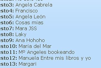 Iremos actualizando la lista poco a poco. Os rogamos paciencia, porque el fin de semana nos dificultará a algunos la tarea. De todos modos, cuanto más rápido nos enviéis vuestra lista, antes podremos rematar el asunto y más pronto os llegarán los libros.Habréis visto que “sobra” un libro. Ese será para el elegido por el azar en primer lugar. De todos modos, solo nos enviarás el libro que quieres de todos ellos, porque el otro libro será el que quede tras elegir el resto de tus compañeros. ORDEN DE ELECCIÓN
