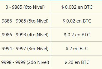 El primer apartado es «Free BTC«, aquí encontramos la Faucet como tal. En Freebitcoin podremos reclamar cada una hora, y la cantidad que ganemos estará determinada por el número que saquemos, para hacer el tiro completamos el captcha y le damos al botón «Roll». El número que saquemos será entre 0 y 10 000, si sacamos el número 10 000 tendremos una tirada de 1er nivel, y la recompensa sería 200$ en bitcoins al precio en el que jugaste. a medida que van subiendo los niveles de tu tirada la recompensa es dividida entre 10, de esta forma si sacas 9998 o 9999 sacarías un 2do nivel y la recompensa sería de 20$. Esta tabla indica los niveles y la recompensa