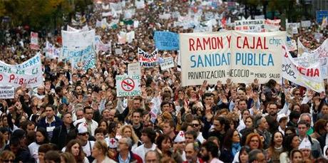 La González y Aguirre tendrán que envainarse la privatización sanitaria. El pasado domingo, como todos los terceros domingos de cada mes, la Marea Blanca salía por primera vez, en el 2014, a la calle. La protesta en defensa de la Sanidad Pública llegaba a su decimoquinta marcha. Los asistentes a la manifestación marcaban su paso tras la última decisión del Tribunal Superior de Justicia de Madrid (TSJM) por la que la externalización de los servicios de seis hospitales y 27 centros de salud continuaban suspendidos. Al día siguiente, la Comunidad de Madrid renunciaba a su plan privatizador y dejaba “sin efectos” el proceso en los hospitales Infanta Sofía, Infanta Cristina, Infanta Leonor, del Sureste, del Henares y del Tajo. La Comunidad de Madrid pretendía ahorrar un total de 169 millones de euros anuales con el traspaso de la gestión hospitalaria, pero Ignacio González, presidente de dicha Comunidad, no tuvo más remedio que rectificar, tras la presión social y el varapalo judicial. Y el consejero de Sanidad, Javier Fernández-Lasquetty, autor intelectual del proyecto que tachó la Marea Blanca de irresponsable, dimitió. La Marea Blanca confirmaba su gran lema: “La Sanidad Pública no se vende, se defiende”. Las protestas contra la privatización sanitaria estuvieron acompañadas de jornadas de huelga de batas blancas, de encierros en centros hospitalarios, de recogidas masivas de firmas y consultas populares y de dimisiones en masa de directores de centros de salud y de jefes de servicio de hospitales. Ni el frío, ni el calor, ni la lluvia les impidió sus protestas, con las que impidieron las consecuencias de la privatización y el respaldo de una gran masa social que les acompañó en las diferentes movilizaciones.