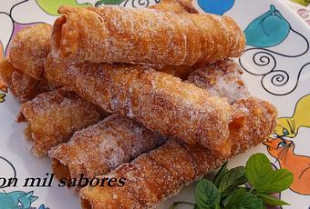Hacemos tiras con la masa, las estiramos con un rodillo y las liamos en unas cañas ó en unos cilindros de acero inoxidable. Las freímos en abundante aceite de oliva hasta que estén doradas. Se sacan de las cañas y se emborrizan con azúcar.Quedarán muy crujientes.Buen provecho amigos!!.