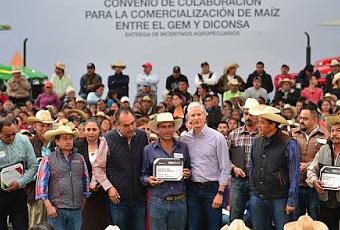 Sultepec, Estado de México, 12 de enero de 2018. Para apoyar a más de 2 mil 500 productores mexiquenses, el Gobernador del Estado de México, Alfredo Del Mazo Maza, y el Director General de Diconsa, Héctor Velasco Monroy, firmaron un convenio de colaboración, el cual garantiza la comercialización de 30 mil toneladas de maíz blanco del pasado ciclo agrícola.“Con este convenio que firmamos el día de hoy, son 30 mil toneladas de maíz que se van a comprar por parte de Diconsa, y que apoya a más de 2 mil 500 productores de maíz del Estado de México, al garantizarles la compra de esa producción de maíz”, puntualizó.Luego de firmar el Convenio de colaboración para la comercialización de maíz entre el Gobierno del Estado de México y Diconsa, Héctor Velasco explicó que el maíz mexiquense se distribuirá en diferentes regiones del país, a través de casi 27 mil tiendas Diconsa, y que será comprado a un precio de 3.65 pesos el kilo, y vendido al público en 4.30 pesos.En esta gira de trabajo, Del Mazo Maza reiteró el compromiso del Gobierno estatal para seguir fortaleciendo al sector agropecuario de la entidad, con acciones como ser el primer estado del país en integrar a la producción de aguacate, a la cobertura del "Seguro Nacional Catastrófico".Mediante esta acción, dijo, se asegura el pago de la cosecha en caso de que las condiciones climatológicas dañen este producto.También el mandatario mexiquense se comprometió a mejorar infraestructura, equipamiento, tecnología, capacitación, semilla y espacios de almacenamiento e impulsar la comercialización de los productos del agro de la entidad.“Dándole el apoyo al campo mexiquense le damos el apoyo a las familias mexiquenses y hacemos familias fuertes en el Estado de México, que tengan mejores ingresos, mejores oportunidades y la posibilidad de un mayor desarrollo, nuestro mayor objetivo es que tengamos familias fuertes en el Estado de México”, manifestó.El titular del Ejecutivo estatal destacó que al apoyar al campo mexiquense, este sector continuará siendo líder a nivel nacional en producción florícola, de durazno, haba, tuna, nopal y maíz, entre otros.“Debemos de estar muy orgullosos de lo que se ha logrado y debemos de seguir impulsando este gran talento que tiene el campo mexiquense para ser líder, como lo es hoy en día, y continuar siendo líder a nivel nacional”, sostuvo.En este evento, productores agropecuarios de los municipios de Almoloya de Alquisiras, Almoloya de Juárez, Amanalco, Otzoloapan, Sultepec, Villa Victoria Texcaltitlán y Tejupilco, entre otros, recibieron material de construcción, herramienta y apoyos económicos para fomentar el desarrollo agrario de la entidad.Darío Zacarías Capuchino, Secretario de Desarrollo Agropecuario, precisó que para la entrega de estos apoyos se destinaron más 101 millones de pesos, en beneficio de 3 mil 794 productores.