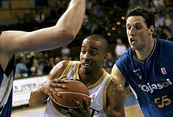 Bullock entra a canasta ante Savanovic y Radenovic -EFE.Tomado como agitatoallas durante gran parte del curso, Bullock está siendo el mejor de su equipo en los playoffs y resultó clave en Sevilla para que su equipo empatase la serie de cuartos y forzase el tercer partido ante Cajasol (71-76). Sweet Lou contribuyó con 17 puntos y encontró a un aliado también cuestionado, Garbajosa (15). Ambos anotaron once tantos en el último cuarto, muy disputado por los locales, pues las cosas podrían haber sido distintas si Calloway (18) no hubiese fallado una penetración tras robarle un balón a Prigioni. Una acción que, a poco menos de un minuto para el final, hubiese puesto a Cajasol cinco por debajo. cuando había llegado a ceder por 23. Consolado por Kirksay y Radenovic, el ex base de Cibona cometería personal sobre el propio Bullock, quien no fallaría los dos tiros libres y sentenciaría el partido. El lunes (20.30 horas, La 2) se decidirá quién es el semifinalista de este cruce.