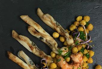 Una vez que se han abierto las navajas, se deja que se doren un poco más y se sirven con los garbanzos calientes, los langostinos salteados en el aceite de las navajas y unos germinados.