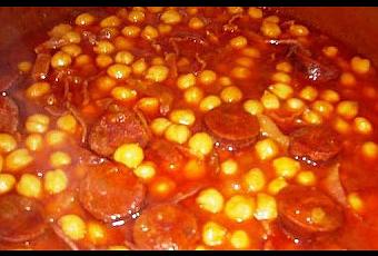 Agregamos entonces los garbanzos escurridos y lo cubrimos todo con medio litro de agua hirviendo. Aromatizamos con la hoja de laurel. Ha de cocer durante dos horas desde que empiece a hervir, desespumando el caldo siempre que sea necesario. Han de quedar ligeramente caldosos.