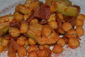En verano no debe de dejarse de comer legumbres, sea bien en ensalada o en salteados, entiendo que apetece menos un plato de cuchara, por lo de las calores pero como hay otras formas de prepararlo, así que no hay escusa.De esta manera lo he preparado yo para llevarme en mi tapper al trabajo, que os parece!!.Vamos con la receta.Ingredientes:Un bote de garbanzos cocidosUna lata de corazones de alcachofasMedia cebollaUn diente de ajoUn par de cucharadas de tomate fritoUnas lonchas de jamón no muy finasAceite de oliva virgenSal (opcional)PimientaPimentón de la veraPreparación:Lavamos bien y escurrimos los garbanzos, reservamos.Escurrimos las alcachofas y partimos por la mitad, reservamos.Cortamos el jamón a trocitos, reservamos.Partimos la cebolla y el ajo a trozos pequeños.Ponemos en una sárten un poco de aceite y freímos el ajo y la cebolla.Añadimos los trozos de jamón y saltemos un poco.