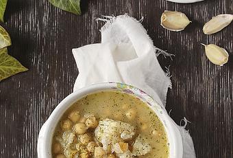 Ingredientes:- 2 botes de garbanzos cocidos.- 395 g de bacalao desalado.- 1 diente de ajo.- 1/2 cebolla.- Un puñado de arroz.- Perejil picado.