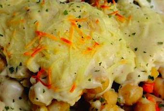 - Abrir, retirar las verduras y escurrir los garbanzos. Ponerlos en una fuente de cristal, junto con la zanahoria y el chorizo picado. Espolvorear con comino molido, cubrir con una bechamel ligera y queso rallado, y gratinar.