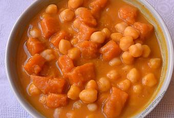 En un plato servimos los garbanzos y la calabaza que ha quedado cocida en la sartén. Lo mezclamos todo y añadimos la salsa cremosa de calabaza por encima.