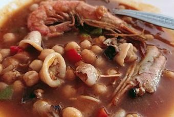 2 frascos de garbanzos cocidos Pedrosillanos2 o 3 calamares2 gambas por persona1 cebolla1 diente de ajo1 pimiento verde1 pimiento rojo mediano1 litro de fumetAceite de olivaSalElaboración:Poner aceite a calentar en una cazuela, y saltear las gambas por ambos lados. Una vez que estén doradas, retirar y reservar en un plato.En ese mismo aceite, hacer un sofrito, añadir la cebolla picada, seguidamente el ajo y los pimientos cortados a cuadraditos pequeños.