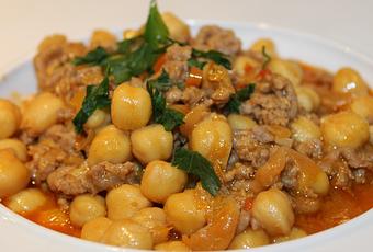 Lo primero que vamos haces es cocer los garbanzos. Yo normalmente los compro congelados ya que es más rápido de hacer pero podemos hacerlos como siempre. Ponemos en remojo los garbanzos durante 24horas en agua. Cuando ya tengamos los garbanzos en remojo, los escurrimos con la ayuda de un colador, cogemos una olla express, echamos un litro y medio de agua más o menos, metemos un laurel y lo dejamos cocer unos 50 minutos. Los garbanzos congelados la cocción es más rápida, 10 minutos cociendo tendremos suficientes. Cuando lo tengamos cocido, reservamos y hacemos el sofrito.Cogemos una tartera, echamos en la base aceite de oliva, cuando tengamos el aceite caliente, echamos el ajo picado, cebolla picada y el chile picado. Cuando rehogamos todo, echamos una cucharada de pimentón de La Vera, removemos y echamos 3 cucharadas de tomate frito. Ahora echamos la carne picada que hemos salpimentado anteriormente y la hacemos. Cuando tengamos la carne dorada, echamos los garbanzos y un vaso de agua. Rectificamos con Sal y lo dejamos unos 5 minutos más.