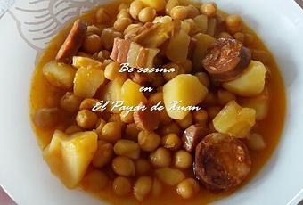 Ingredientes:500 gr de garbanzos100 gr de chorizo150 gr de panceta1 cebolla2 ajos1 hoja de laurelaceitepimientasal
