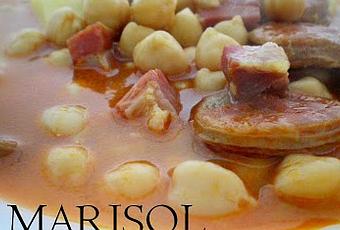 Sofreír en el aceite la cebolla y el ajo en una olla, cuando este echo le añadimos los garbanzos lavador y escurridos la patata y le damos unas vueltas, ponemos el chorizo, jamón y a las dos o tres vueltas echamos la carne de pimiento y cubrimos con agua, dejar cocer por espacio de 20 minutos, rectificar de sal y servir.
