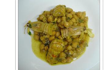 Cuando esté sofrito añadir los garbanzos y un vaso de caldo de pescado o agua.Dejar cocer unos 15 minutos. Añadir perejil picado y cocer 5 minutos más.