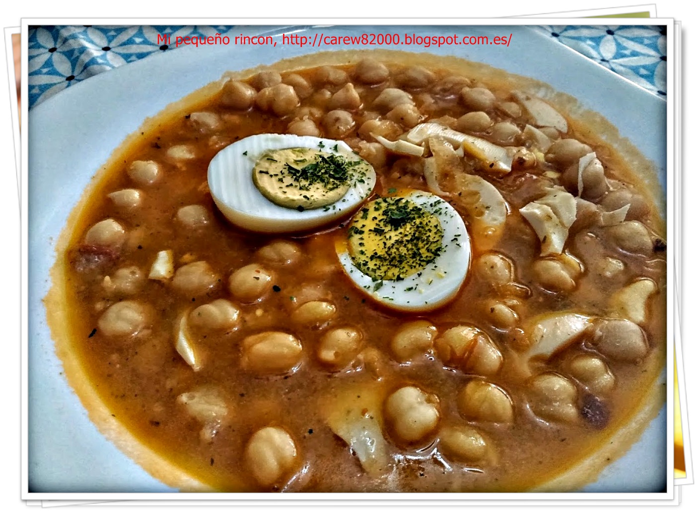 - 500 gr de garbanzos - 2 cebollas grandes- 4 tomates grandes maduros- 4 rebanadas de pan- 1 litro de caldo de pollo - 5 huevos- 4 dientes de ajo- perejil picado- laurel- Aceite de oliva- salElaboración:La noche antes ponemos los garbanzos en remojo en una cazuela con agua hasta cubrir.Escurrimos los garbanzos y los ponemos a cocinar con el caldo Aneto hasta cubrir los garbanzos, si no es suficiente incorporamos un poco de agua y las hojas de laurel, los tendremos cocinando hasta que se ablanden, lo mejor es hacerlo a fuego lento.