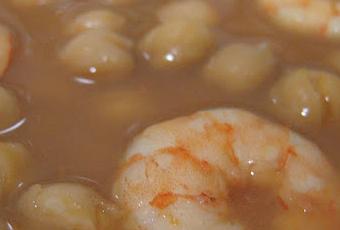 Pelamos los langostinos y reservamos los cuerpos, ponemos las cascaras y las cabezas a cocer con agua, cuando estén colamos y pasamos el caldo a otra cacerola, en la que echamos los garbanzos que habremos tenido en remojo de la noche anterior con un chorrito de aceite, de oliva, claro esta¡¡, y también le echamos el tomate, los pimientos, la cebolla y los ajos, dejamos cocer hasta que los garbanzos estén tiernos, cuando sea así sacamos las verduras y las trituramos, echándolo de nuevo con los garbanzos, en ese momento echamos los cuerpos de los langostinos al guiso y dejamos un pequeño hervor, rectificamos de sal y listos para comer. Tienen un sabor delicioso, a los que no les gusten las verduras se las comen porque como no las ven