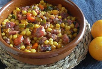300 g de garbanzos cocidos 300 g de morro cocido1 pimiento verde1/2 pimiento rojo1 calabacín pequeño2 dientes de ajo3 tomate maduros ralladosPimienta molida2 hohas de laurelAceite de oliva1/2 litro de caldo de carneSalElaboración:Lavar las hortalizas y cortarlas en cubitos. Los ajos picar muy fino.Poner en una cazuela aceite para sofrír las verduras, primeros añadir los ajos y seguidamente la cebolla, sazonar. Dejar cocinar unos 10 minutos a fuego suave y seguidamete incorporar el resto de las verduras, dejar 15 o 20 minutos más que se cocine a fuego suave.Añadir el tomate rallado, sazonar y dejar cocinar hasta que se evapore el agua. Puede tardar unos 20 minutos.