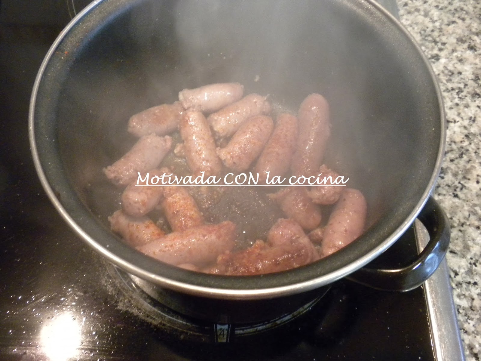 1. Se pone en una cazuela, un chorrito de aceite de oliva hasta que se caliente. Cuando esté caliente, se añaden las salchichas, y se fríen.
