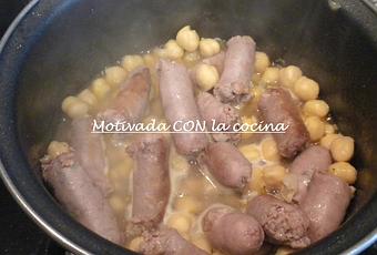 3. Se añaden los garbanzos y se echa agua hasta cubrirlo. Se deja cocer durante 10-15 minutos.