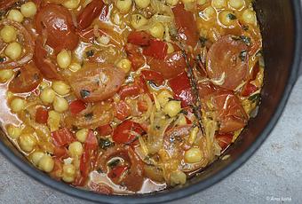 - Destapar y añadir las hierbas aromáticas finamente cortadas con unas tijeras. Añadir los garbanzos cocidos y dos cucharadas de salsa romesco. Mezclar bien, tapar y dejar cocer 10 minutos más.