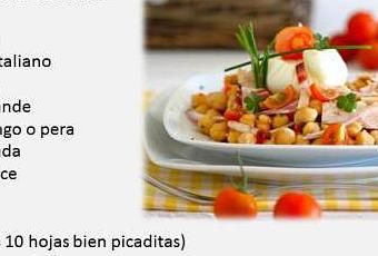 Una hora antes de la comida cortamos todas las verduras en Brunoise menos las hojas de lechuga y el maíz. Ponemos en un bol los garbanzos fríos y escurridos, las verduras, el maíz, le añadimos un poco de sal a las verduras. Hacemos la vinagreta y la emulsionamos y la ponemos en el bol junto a la menta picadita y mezclamos todo bien. Dejamos en la nevera unos 30 minutos.