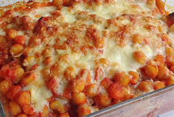 - En una fuente para el horno, poner los garbanzos escurridos y la salsa de tomate; cubrir con queso rallado y gratinar en el horno hasta que se funda.