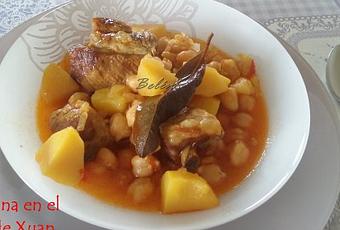 Ingredientes:200 gr de garbanzos cocidos300 gr de costillas adobadas y troceadas4 patatas2 ajos1 cebolla1 pimiento rojo1 pimiento choricerolaurelaceite sal