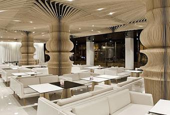 Las formas volumétricas, que se realizan con lamas de madera en pilares, y que cubren el falso techo son como raíces que protegen el espacio y consiguen destacar sin robar la atención. (bueno...al principio no nos engañemos...nos deja con la boca abierta).