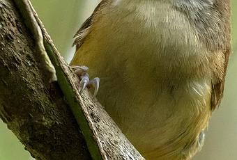 También es conocido en el Brasil como cambaxirra-grande, garrinchão-bicudo, corruíra-açu, corruiraçu, corruiruçu, framato (Ilha Grande, Rio de Janeiro), gambacheira-grande, garrincha-de-bico-grande, garrincha-açu, rouxinol (Bahia) e papa-taoca (Santa Catarina). Mide 15 centímetros de largo. Tiene alas y cola finamente barradas de negro y vientre rojizo y un pico extremadamente largo, de 25 milímetros. Un ave que remotamente se parece a una Corruira, no en vano tienen el mismo nombre popular. Tiene como color predominante el marrón óxido, volviéndose más claro en algunas partes y más intenso en otras. El color marrón del dorso es más fuerte y se extiende desde la frente hasta la punta de la cola, pero a la altura de las alas y la cola, su pelusa marrón está completamente barrada con líneas negras horizontales. En su región ventral el pardo es más claro, donde en la garganta, mejillas hasta el tórax se vuelve prácticamente blanco en algunos individuos, y en el vientre predomina un pardo amarillento. Alrededor de sus ojos son blancos, pero tiene una banda transocular marrón. Su pico es fino, gris y bien formado. Es omnívoro, en su menú predominan los artrópodos y sus larvas. También se le puede ver alimentándose o bebiendo el agua de algunas especies de Heliconia. Vive al borde del bosque, bosque secundario denso, caatinga y también suele frecuentar manglares. Es de naturaleza inquieta. A veces se desplaza por el suelo saltando entre ramas y follaje. Delata su presencia por el ruido que hace al remover y voltear hojas secas a baja altura o en el suelo. Duerme en su propio nido, a veces la pareja junta e incluso toda la familia. El individuo puede hacer un pequeño nido para dormir solo.