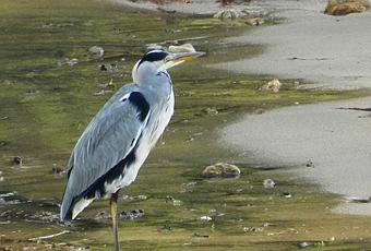 Uno de los ejemplares más interesantes que observé fue un adulto de garza real Ardea cinerea, tranquilamente posado en la orilla entre las gaviotas. Esta especie, muy asustadiza y tímida, no es nada fácil de contemplar de cerca.