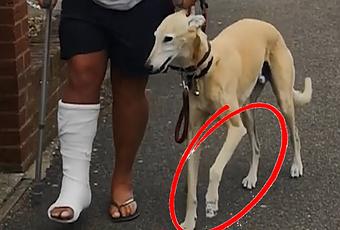 En el video compartido por Rusell se puede ver al inseparable par caminando: su amo enyesado, y el can imitando su movimiento por el mal caminar que producen las muletas.